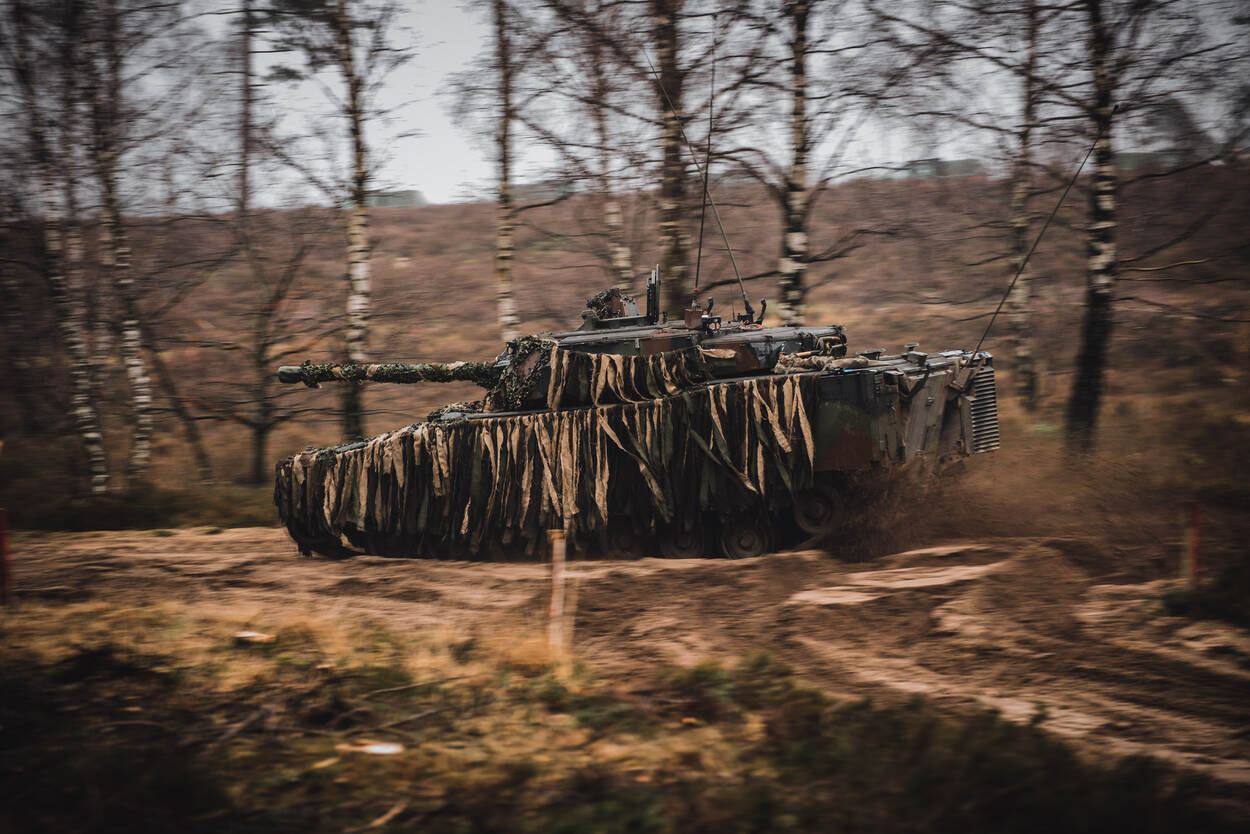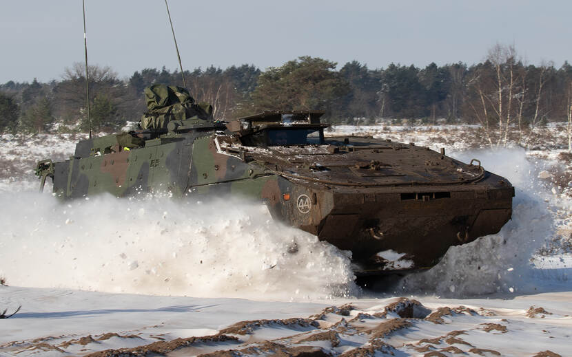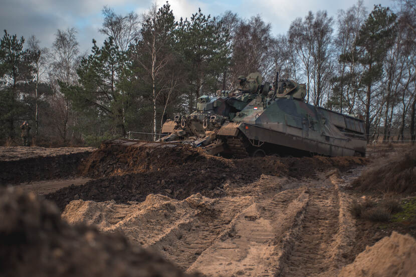 Soldaat-1 Wessel Zuijderduin zette de compagniesoefening Hazewind op de gevoelige plaat. Voor het eerst sinds de corona-uitbraak traint de eenheid in een nieuwe voorwaartse samenstelling. Daarbij wordt samengewerkt met 111 en 112 Pantsergeniecompagnie. Beide eenheden zijn ook van de partij tijdens de uitzending van 44 Pantserinfanteriebataljon naar Litouwen dit jaar. Het oefendoel in de verte werd overigens succesvol ingenomen.