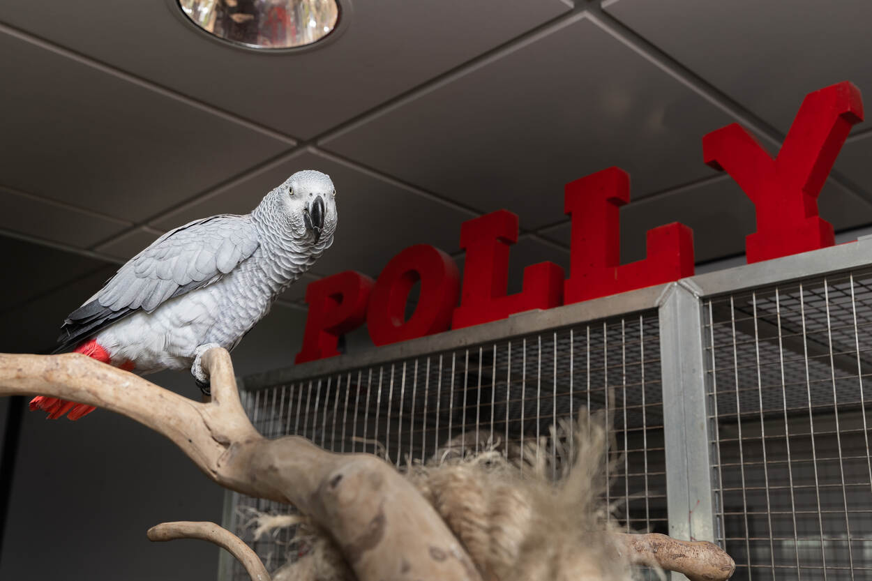 Ondertussen zit de vogel rustig op een appeltje te knagen. Een ware traktatie. Collega’s die ze kent geeft ze kopjes en gaat daarbij gretig op de schouder zitten. Ze weet ook precies wie ze niet leuk vindt, daar hapt ze naar. “Als we zitten te praten en je betrekt Polly erbij, dan is ze heel rustig. Maar op het moment dat je op een afstandje gaat staan, zingt en praat Polly net zolang tot je haar erbij haalt. Het is een gezelschapsdier.”