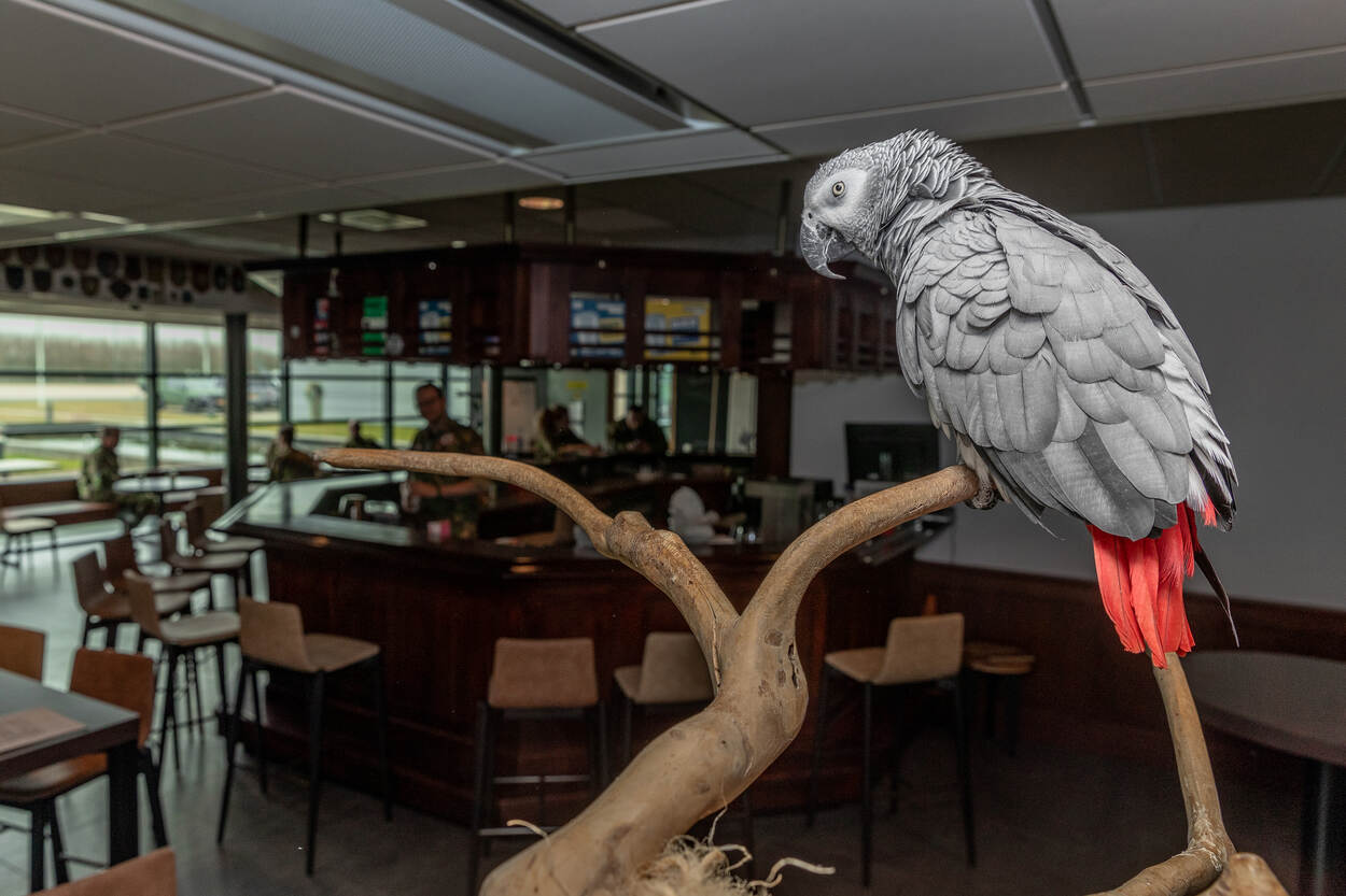 ‘Niet praten, maar doen’. De wapenspreuk van 322 krijgt wel een hele bijzondere betekenis als je weet dat de mascotte een papegaai is. “En wist je dat deze papegaaien de beste praters zijn, maar de slechtste vliegers”, doet Polly’s vaste verzorger sergeant-1 Berry Stolk er nog een schepje bovenop.
