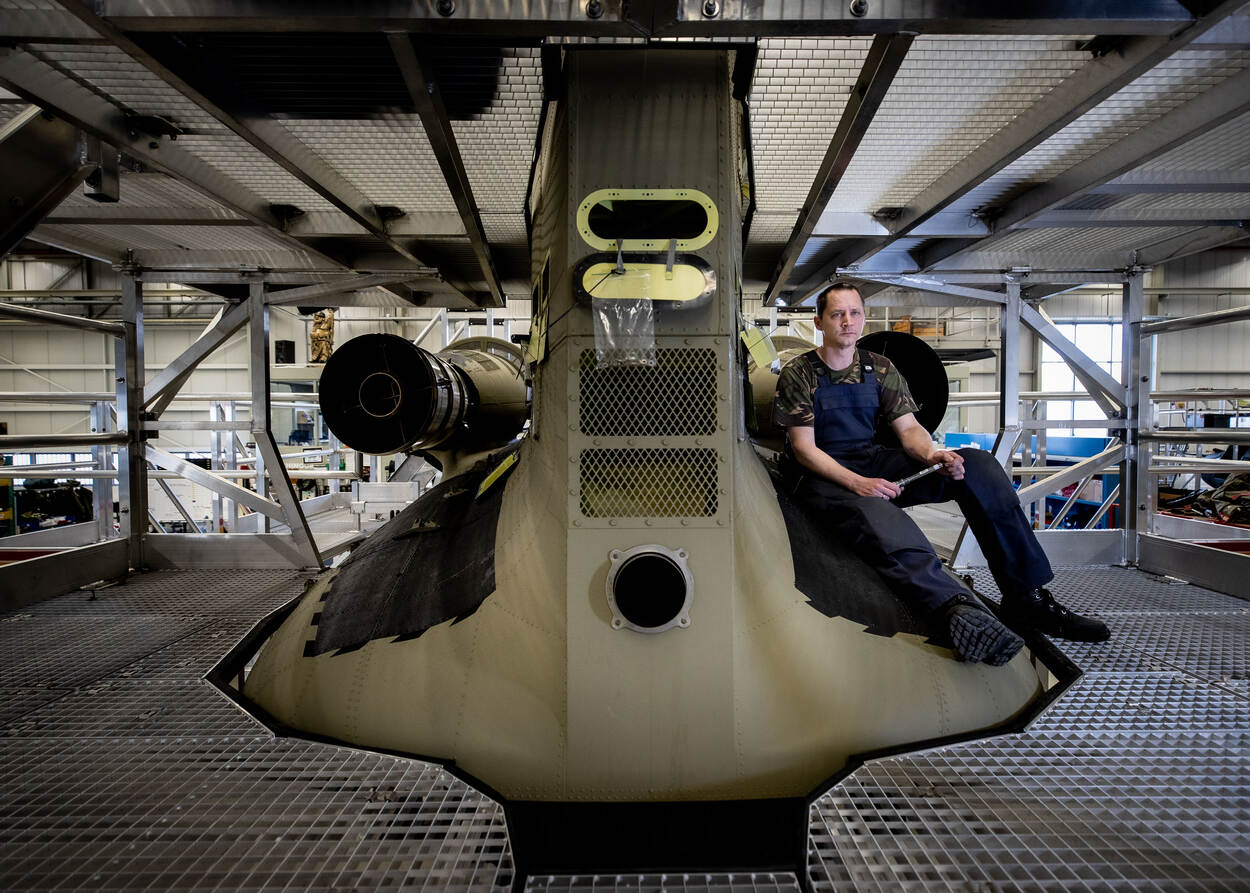 Vakwerk van fotograaf sergeant-majoor Maartje Roos. Zij portretteerde deze onderhoudsman tijdens zijn werkzaamheden aan een fonkelnieuwe CH-47F Chinook transporthelikopter. De mooi belichte plaat werd geschoten op vliegbasis Woensdrecht.