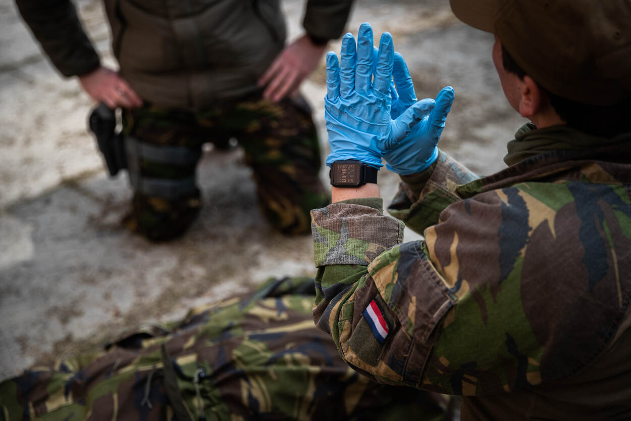 Sergeant Aaron Zwaal was erbij toen onlangs in de Marnewaard de eerste oefening plaatsvond van het nieuwe wapen Communication and Engagement (C&E). Er werden een aantal scenario’s gedraaid, waaronder netwerken met de lokale bevolking en het vergaren van inlichtingen. Deze foto werd genomen tijdens een les Zelfhulp en Kameradenhulp.