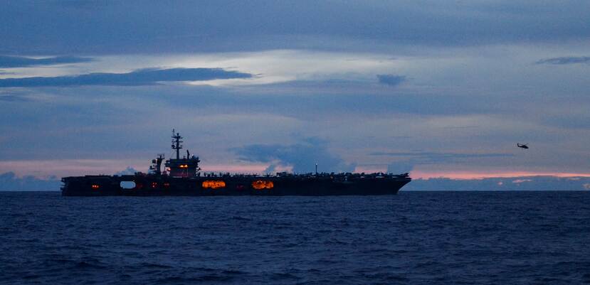 Scheepsfotograaf Specialist 3rd Class Wade Costin nam deze foto van de USS Theodore Roosevelt op de Indische Oceaan. Het vierde vliegdekschip uit de Nimitz-klasse voegde zich bij de 7th Fleet, het grootste vooruitgeschoven vlootverband ter wereld. Momenteel bevindt de Zevende Vloot zich in de Indische Oceaan. Naast de USS Roosevelt bevinden zich momenteel nog vier andere Amerikaanse vliegdekschepen op zee. Tijdens haar tour door het Verre Oosten oefent de Amerikaanse vloot met de marines uit 35 landen.