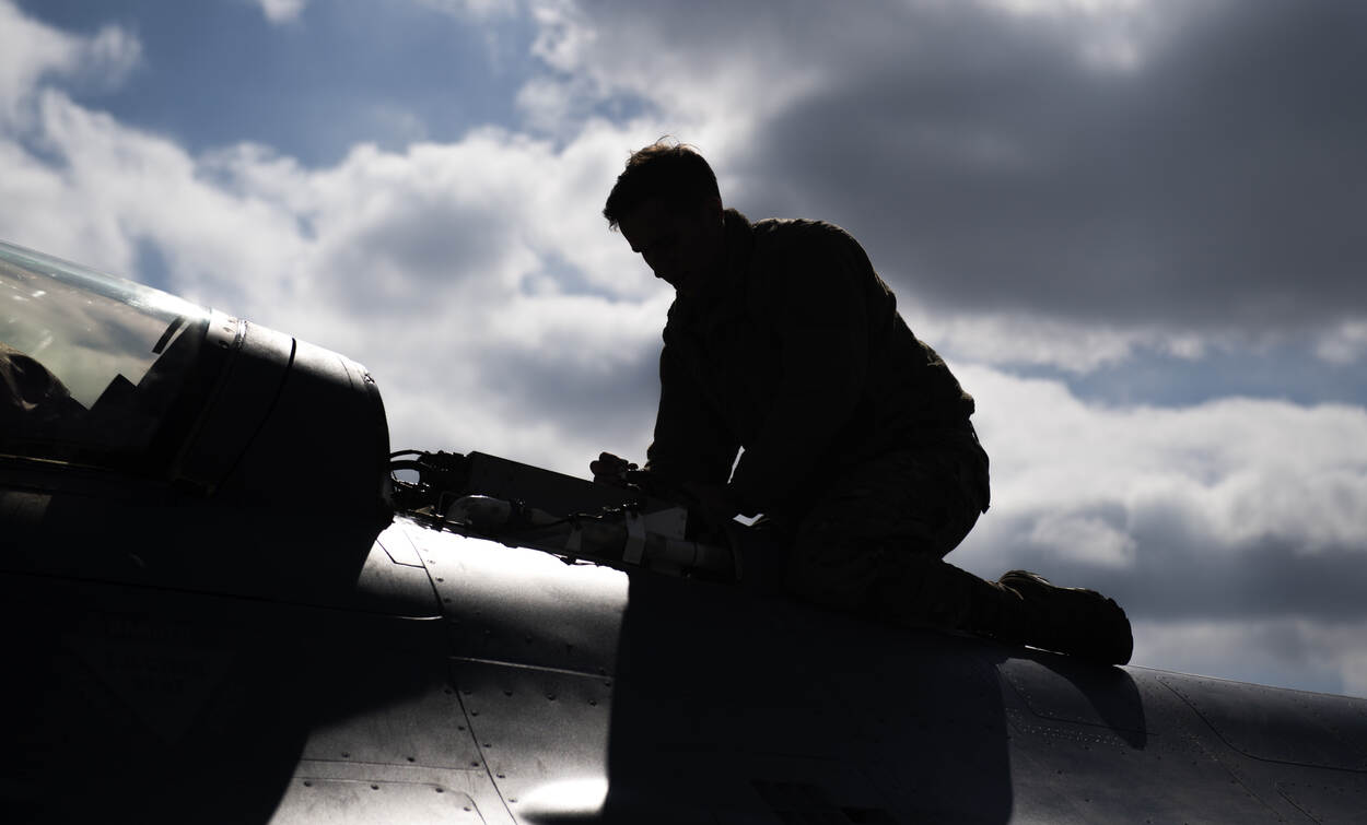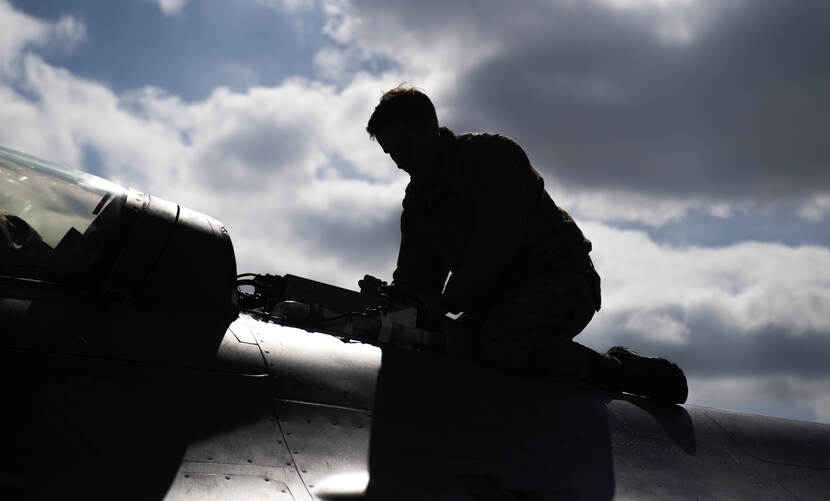 Een F-16 van de Amerikaanse luchtmacht wordt klaargemaakt voor een oefenvlucht met een Nederlands jachtvliegtuig tijdens oefening Point Blank 21-02 vorige week. Senior Airman Ali Stewart maakte weliswaar een kleurenfoto, maar omdat hij tegen het licht in fotografeerde lijkt het een zwart-wit foto. We zien alleen de contouren van vliegtuigtechnicus sergeant Kenneth Birkemeier.