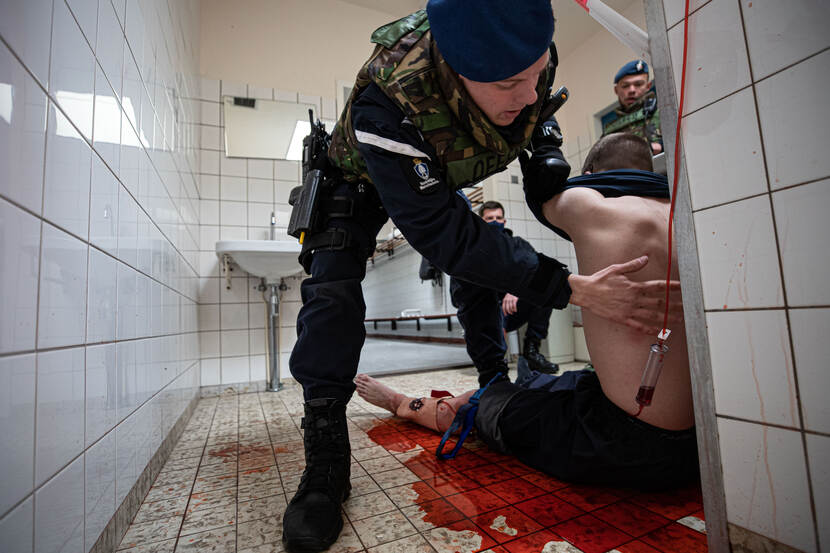 Sergeant-majoor Maartje Roos schoot deze aangrijpende plaat tijdens de opleiding tot operator bij het Eskadron Hoog Risico Beveiliging, onlangs op Kamp Nieuw-Milligen. In de derde week werden de deelnemers geconfronteerd met realistische scenario’s die moeten aantonen of zij uit het juiste hout zijn gesneden.