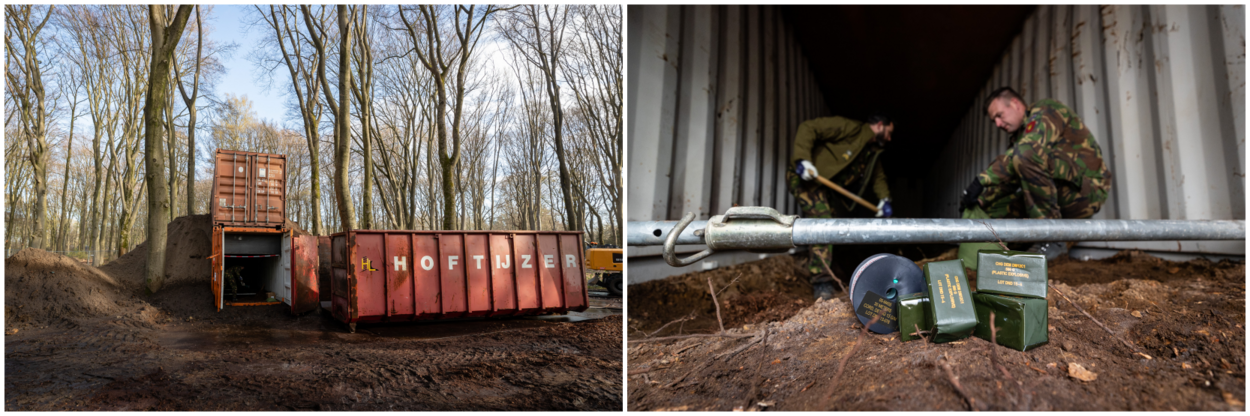 De brandbom die vandaag onschadelijk is gemaakt ligt op dat moment nog in het bos. Ingebouwd in een constructie van containers en een berg zand. Op 21 maart 1945 lieten geallieerde bommenwerpers boven het Hassinkbos 64 bommen, waaronder deze AN-M76, los. Het doel? Een Duitse brandstofopslag.