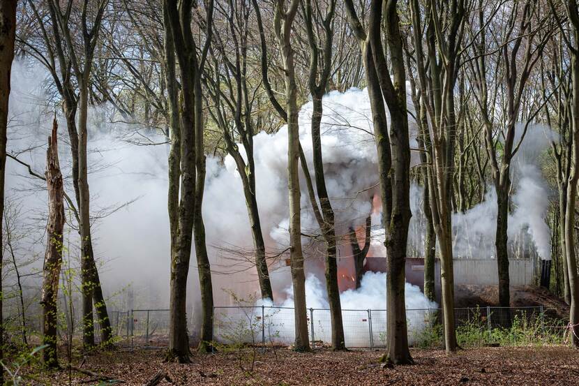 En dan is het even voor één uur ’s middags. De wegen zijn afgezet, bewoners in de directe omgeving moeten binnen blijven. Drie, twee, een….en een doffe harde klap volgt. Tot 1.600 graden Celsius moet het nu in de container zijn. Dikke zwartgrijze en later witte rook komt uit zowel de speciaal gemaakte ‘kachelpijpen’ en de voorkant van de container. Een meetteam van het RIVM controleert op giftige stoffen.