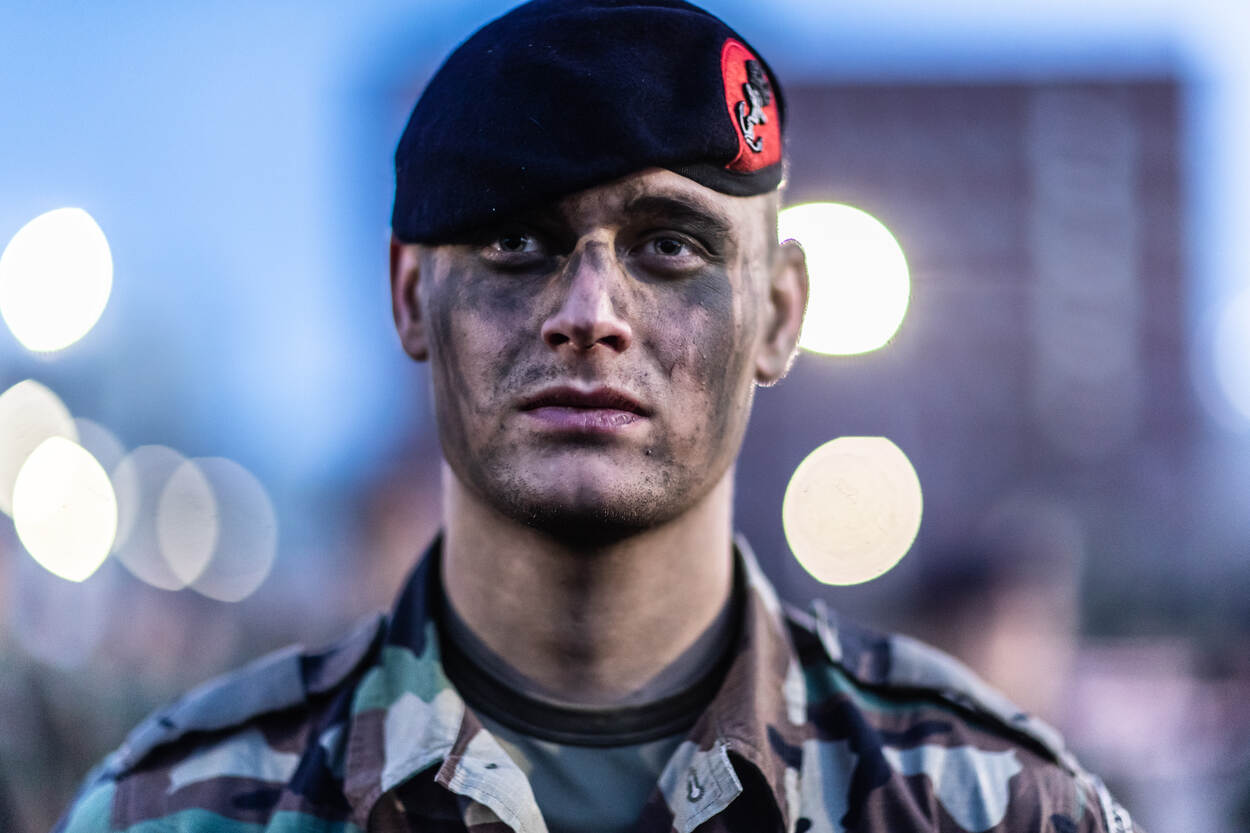 Toen lichting 20-3 van de mariniersopleiding in de vroege morgen van 16 april de Rotterdamse Van Ghentkazerne binnenmarcheerde, was militair fotograaf sergeant Jan Dijkstra present. Hij schoot daar dit prachtige portret van een van de 77 kersverse mariniers. Na aankomst op de kazerne mochten ze de o zo felbegeerde mariniersbaret in ontvangst nemen.