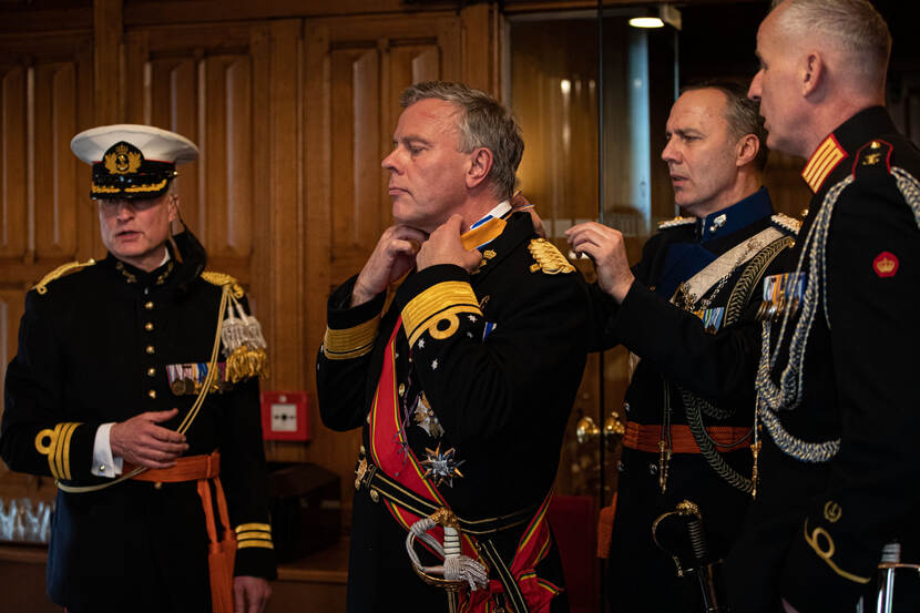Deze foto maakt deel uit van een reportage die sergeant-majoor Maartje Roos maakte van de recente commando-overdracht van de Commandant der Strijdkrachten. Luitenant-admiraal Rob Bauer brengt zijn uniform weer in orde net nadat hij in de Haagse Ridderzaal het commando heeft overgedragen aan zijn opvolger generaal Onno Eichelsheim. Bauers adjudant helpt een handje.