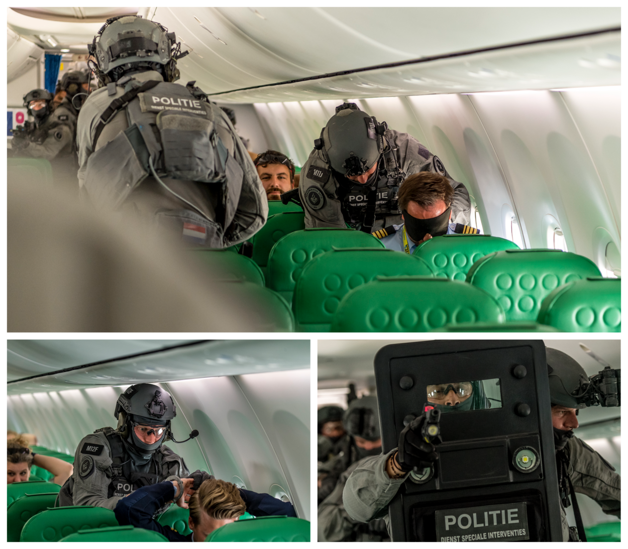 De NLMARSOF operators schieten pijlsnel langs de rijen stoelen als blijkt dat een passagier onder schot wordt gehouden voor een gijzelaar.