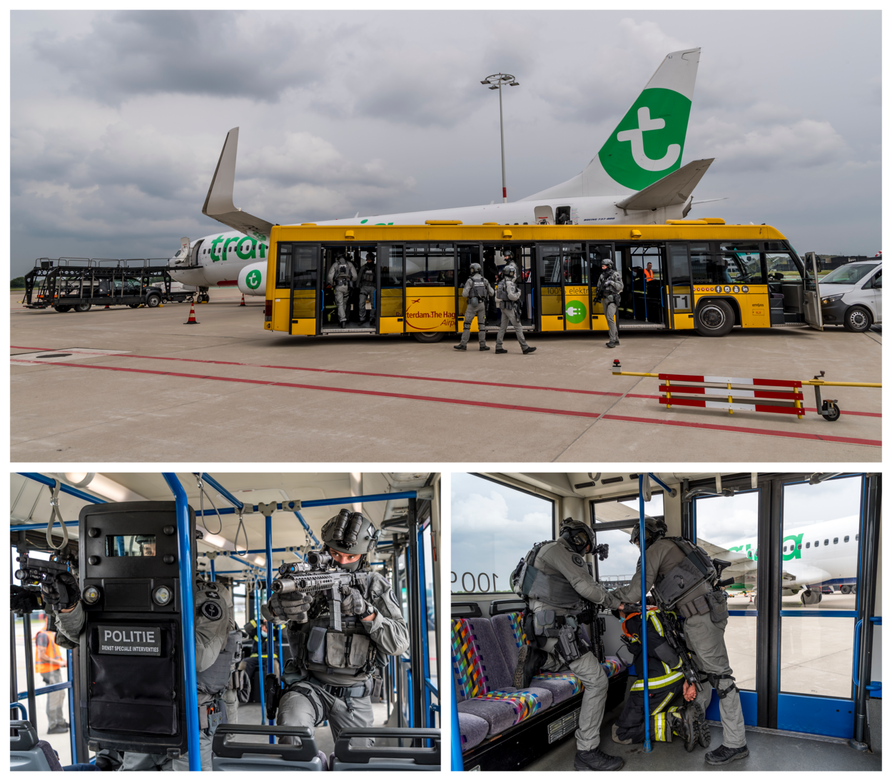 Er werden niet alleen scenario’s gedraaid in een vliegtuig, maar ook in een bus die passagiers naar het toestel bracht. Onderweg werden de passagiers gegijzeld. Aan de operators de taak om de situatie onder controle te krijgen.