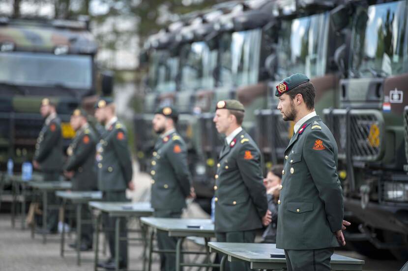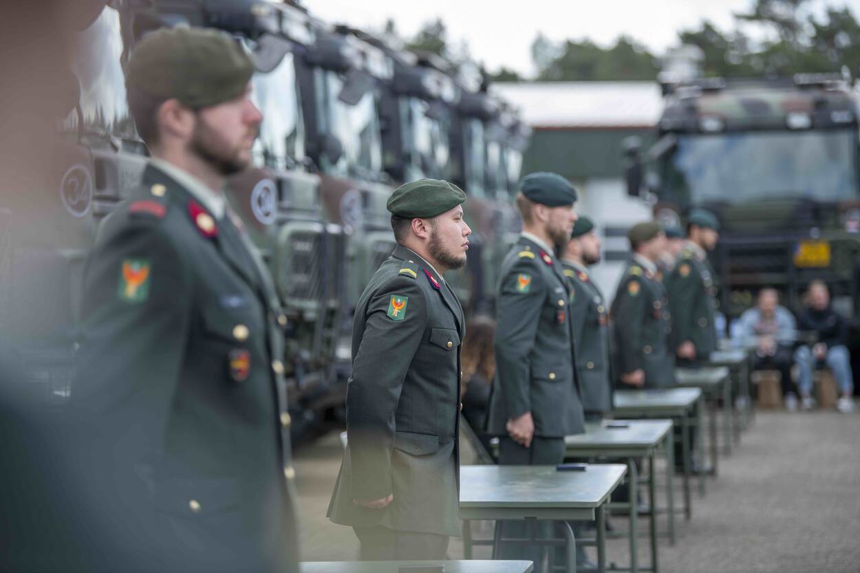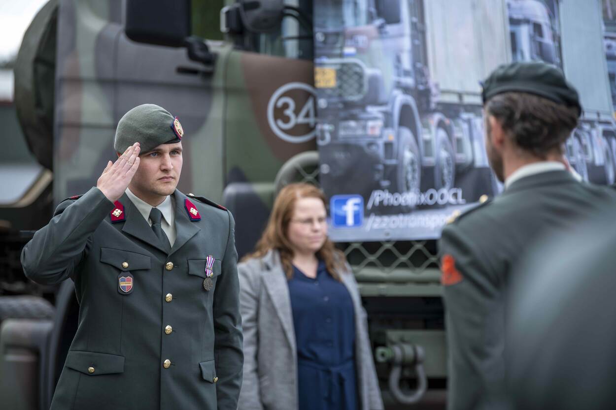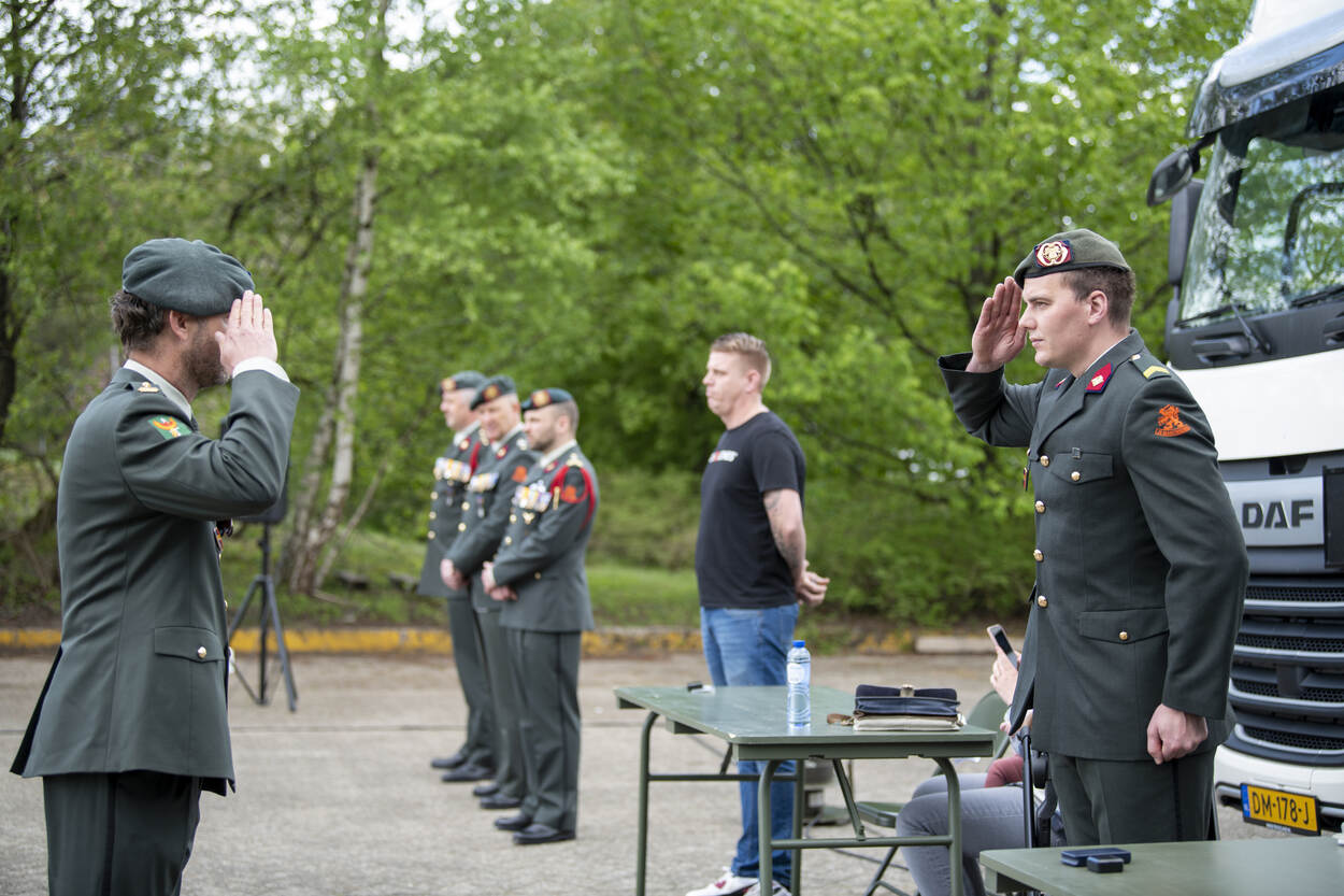 Omgeven door zestien Scania’s op een plein, vergezeld door familie en vrienden, staan de militairen in de lentezon. Het is een bijzondere medaille-uitreiking: na een militaire groet van de commandant van 220 Transportcompagnie majoor Roelof Posthouwer (43) mogen de militairen zélf hun onderscheiding opspelden.