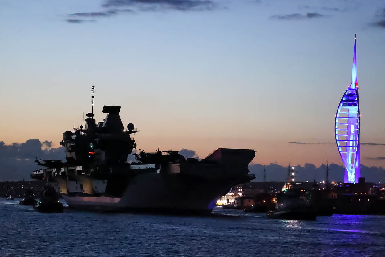 Op de valreep kregen de mannen en vrouwen van Carrier Strike Group 21 nog hoog bezoek. Nadat eerst de Britse minister-president Boris Johnson langs kwam in Portsmouth, landde zaterdag de Britse koningin Elizabeth met een helikopter op het vliegdek van de HMS Queen Elizabeth. Tijdens een rondgang over het reusachtige schip (66.000 ton) sprak de 95-jarige vorstin met personeel en liet zich informeren over het aanstaande avontuur. Nadat de Queen was uitgezwaaid was iedereen klaar voor vertrek en verlieten de schepen de haven van Portsmouth.