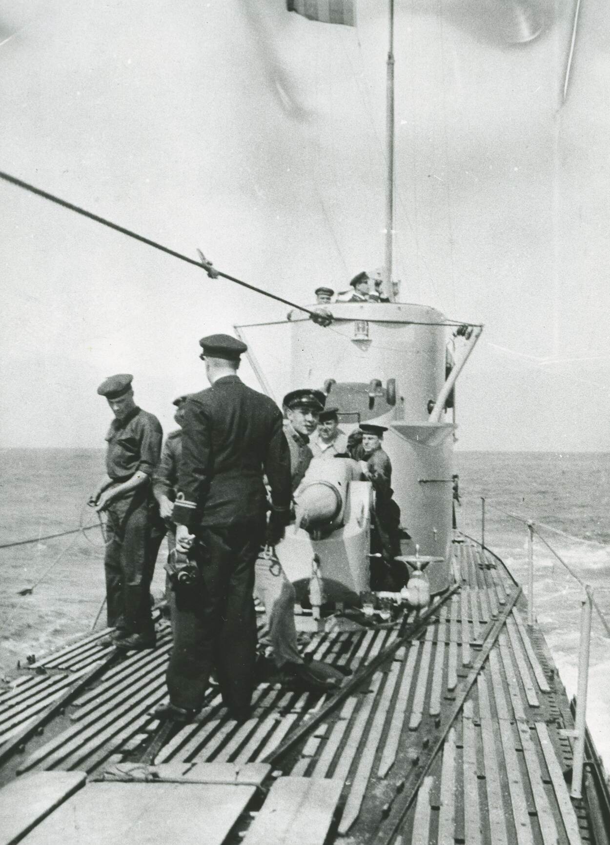De bemanning van Hr.Ms. O-16 maakt aan dek het 8.8 cm. kanon gereed.