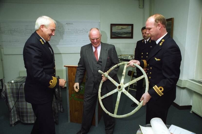 Ton Bussemaker, zoon van de gesneuvelde commandant van Hr.Ms. O-16, bood op 11 november 1995 het geborgen stuurwiel van de teruggevonden onderzeeboot aan commandant Onderzeedienst kapitein-ter-zee J.M. van der Ham aan.