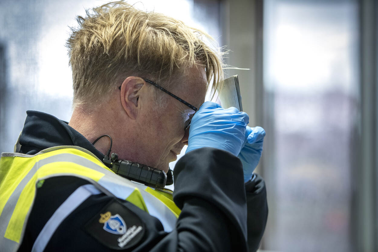 Met een loepje onderzoekt de commandant van de Koninklijke Marechaussee, luitenant-generaal Hans Leijtens, een document. Echt óf vals? Bij zijn werkbezoek aan Hoek van Holland draaide de hoogste baas van de marechaussee een dienst mee met zijn collega's. De aandacht ging niet alleen uit naar de verificatie van documenten, er werd ook gezocht naar 'inklimmers' in vrachtwagens die bij 'de Hoek' Nederland verlaten of binnenkomen. Foto: sergeant-majoor Gerben van Es.