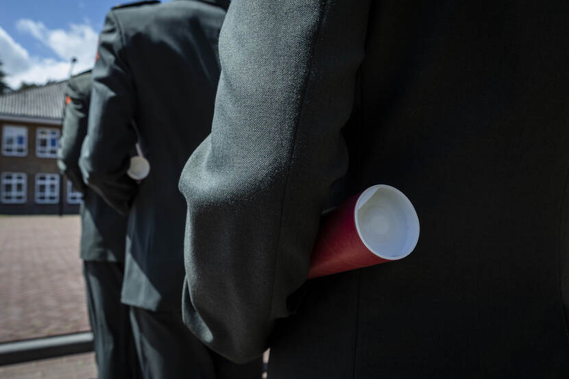 Nou, niet helemaal. Want het diploma dat deze cursist van de Koninklijke Militaire School in Ermelo zojuist heeft gekregen past écht niet de zak van zijn jasje. Gelukkig zit het diploma in een stevige koker zodat de oorkonde niet kan verkreukelen. Snel naar huis, lijstje kopen en het diploma aan de muur hangen, want niet iedereen krijgt een diploma van de KMS. Foto: korporaal Gregory Fréni.
