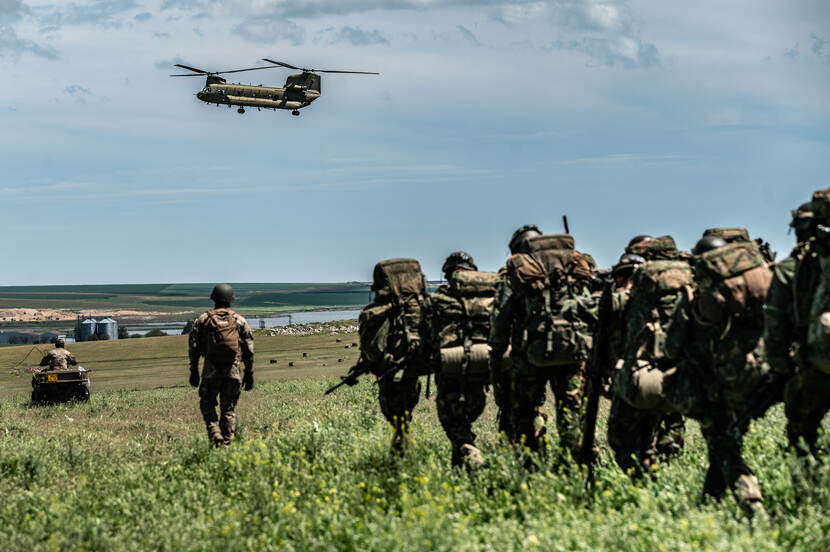 Militairen van 11 Luchtmobiele Brigade lopen in de richting van de plek waar de helikopter op de achtergrond ze zal oppikken. En als militairen lopen, dan hebben ze altijd de neiging om dat geordend te doen. Zelfs wanneer het gaat om een veldje 'ergens' in Roemenië midden in de oefening Falcon Response. En dus is deze actie een foto waard! De foto werd geschoten door 11 Luchtmobiele Brigade.