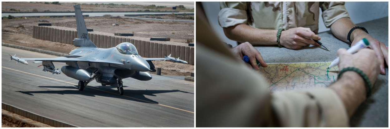 “Voor de anti-ISIS-coalitie werd Nederland tussen 2014 en 2018 ingezet voor het bombarderen van ISIS-doelen in Irak en Oost-Syrië. Vier weken nadat de regering besloot dat we die kant op moesten waren we al operationeel. Samen met partnerlanden ondersteunden we Koerdische en Iraakse troepen op de grond (close air support) en vielen targets aan zoals commandoposten, voertuigen, hoofdkwartieren en opslaglocaties voor munitie (air interdictie).”