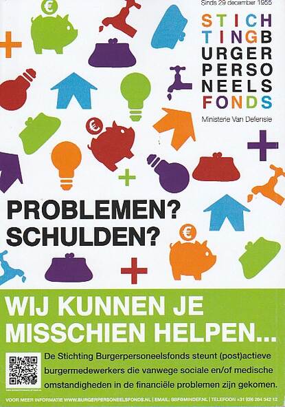 Defensiemedewerkers die door wat voor reden dan ook in financiële problemen zijn geraakt, kunnen voor hulp terecht bij de stichting Burgerpersoneelsfonds (SBF) en de Dienst Bedrijfsmaatschappelijk werk (BMW). Zowel burgers als militairen ontvingen deze week een brief met tekst en uitleg. Reden voor de actie? Goed werkgeverschap.