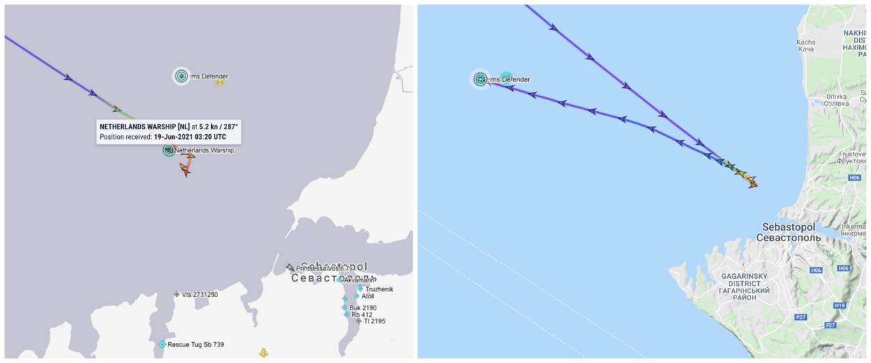Op marinetraffic.com was te zien dat een 'Netherlands warship' en 'British warship' uit Odesa vertrokken. De schepen doorkruisten de Zwarte Zee en zetten koers naar de Krim. In de vroege ochtend van 19 juni namen ze positie in op ongeveer één kilometer van de haven van Sebastopol. De beelden op marinetraffic.com lieten ook zien dat de oorlogsschepen na verloop van tijd weer omdraaiden en wegvoeren. Een opvallende situatie, want Sebastopol ligt op de Krim én is de thuishaven van de Russische marineschepen in dit gebied, de zogenoemde Zwarte Zeevloot. In werkelijkheid bevestigden webcambeelden van de haven van Odesa dat de Evertsen en Defender daar gewoon in de haven lagen en niet van hun plaats waren geweest.