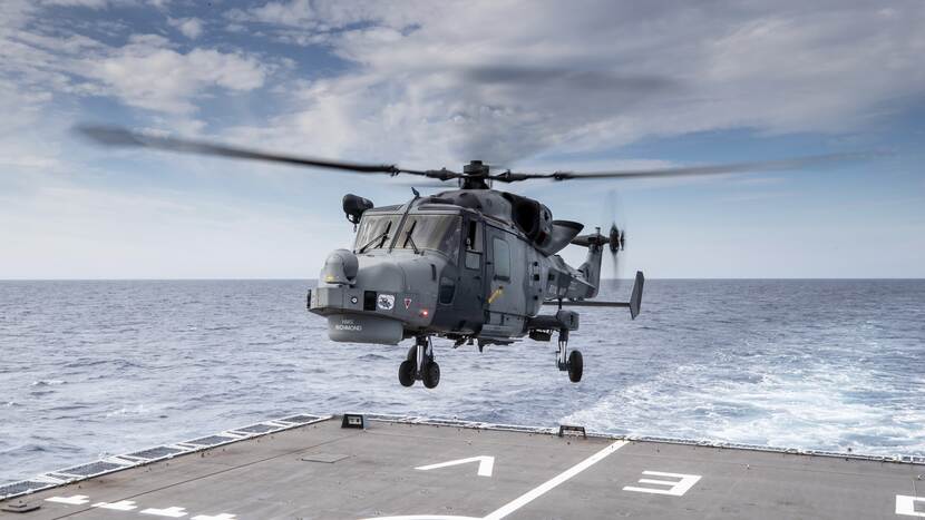 Op weg naar Japan wordt er op volle zee uiteraard geoefend. Fly en cross deck operations komen met regelmaat voor bij de Britse Carrier Strike Group. De deelnemende Zr.Ms. Evertsen kreeg onlangs bezoek van de boordhelikopter van het Engelse fregat HMS Richmond. Dat was om het ‘oplanden’ te beoefenen (het landen van een heli op een dek) én de commandant van de Richmond voor een beleefdheidsbezoek af te zetten. Foto: Zr.Ms. Evertsen.