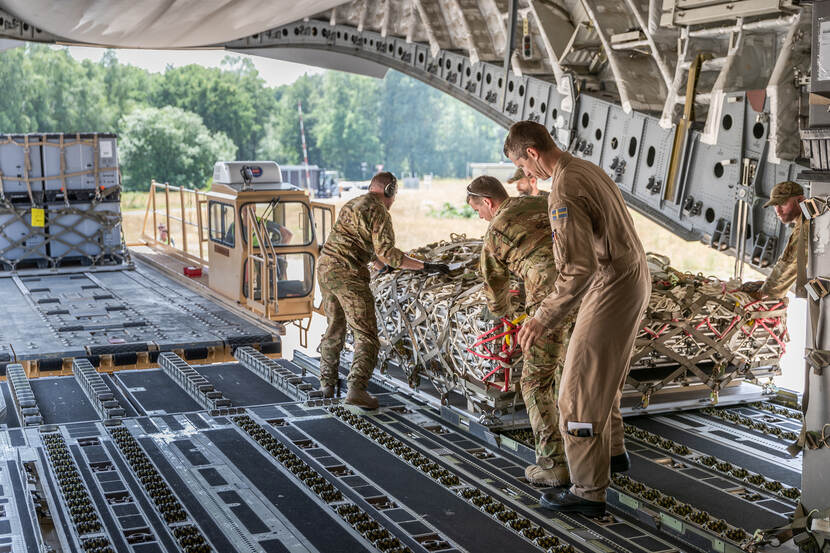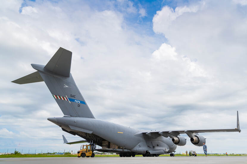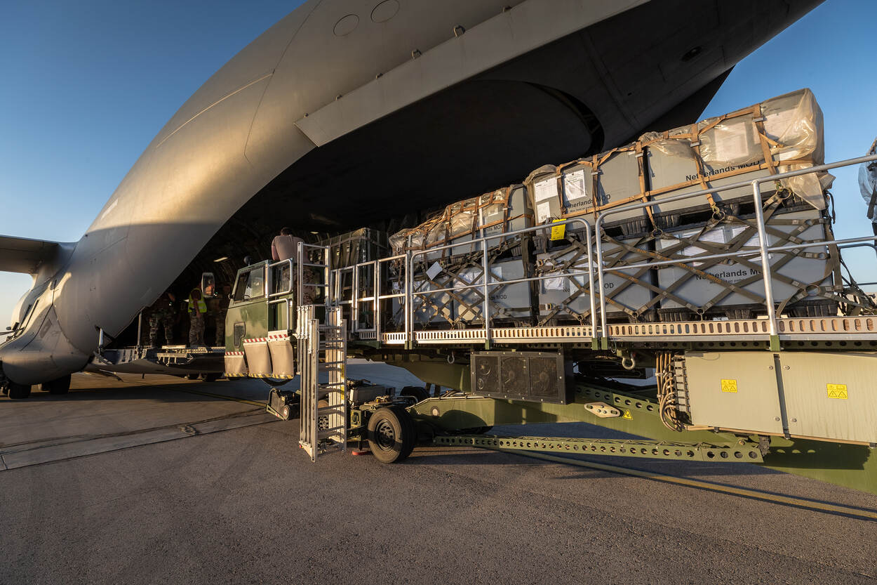 Zodra de achterklep van de C-17 naar beneden gaat, ontvouwt zich een bliksemoperatie. De crew spurt naar buiten. Een Scania met wissellaadsysteem komt meteen aangereden. Van den Berge en zijn collega’s loodsen de vrachtwagen moeiteloos naar binnen.
