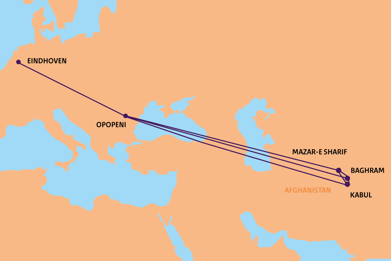 Op dit moment staat er even geen operationele vlucht op de planning, maar één naar Nederland. In twee uur vliegt de C-17 naar de Vliegbasis Eindhoven, waar het proces van uitladen even snel en pijnloos verloopt als in Afghanistan. De laadklep naar beneden en de spullen eruit. Het personeel van de luchtmacht staat klaar om het op te pikken. Het immense ruim is in mum van tijd leeg. Gereed voor de volgende klus. De crew zwaait nog even, dan gaat de ramp weer dicht. In tien minuten tijd hangt de kist weer in de lucht. Terug naar Otopeni, waar het proces van vooraf aan begint.