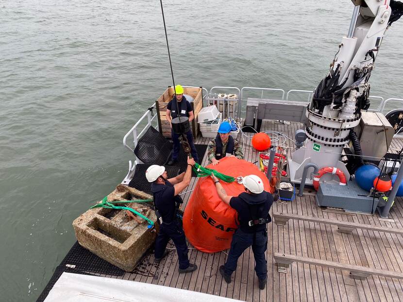 Maar eenvoudig was dat door de sterke stroming in de Westerschelde niet. “Soms moesten de duikers zich achter die bakken verschuilen om uit de stroming te blijven. We moesten zogezegd op hoog en laag water wachten. Als de stroming onder een knoop zat, deden we een poging.”