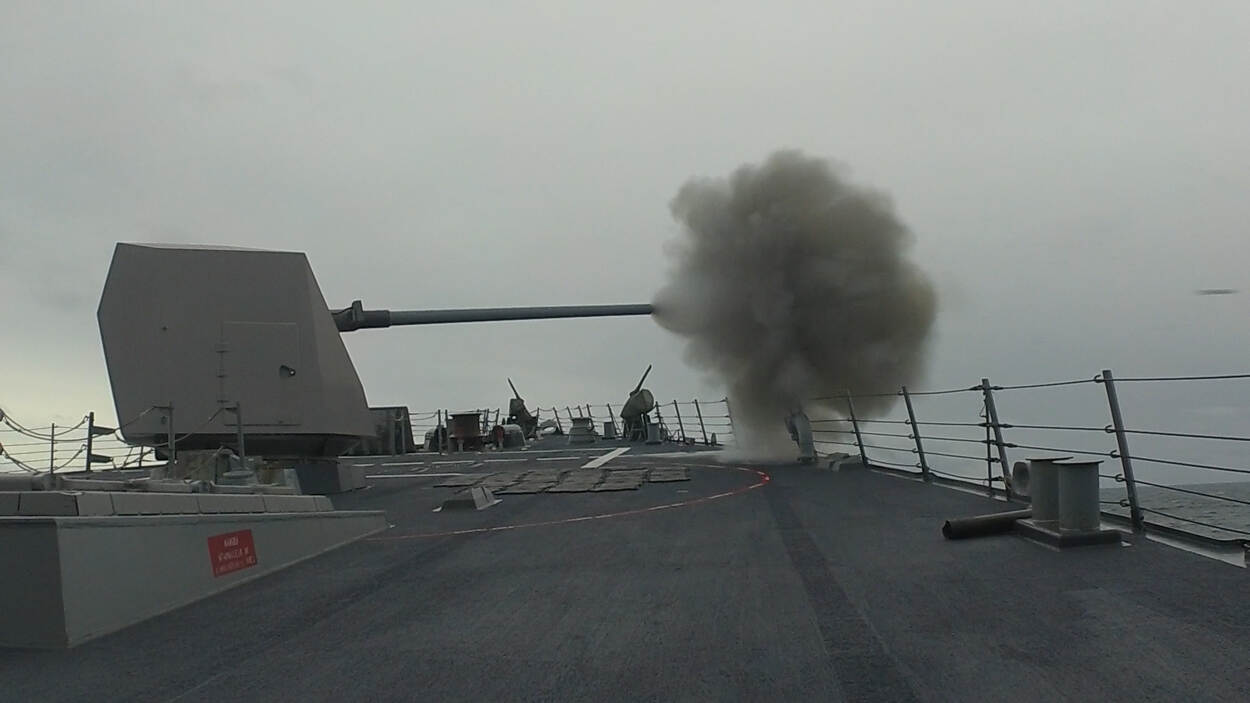 Specialist 2nd Class Andrea Rumple drukte op het juiste moment af toen het geschut van de USS Roosevelt een Mark 45 5 inch granaat afvuurde. De fotograaf legde het beeld vast tijdens een oefening op de Noordelijke IJszee. Het geleide wapenfregat maakt deel uit van de Amerikaanse Sixth Fleet en heeft de Spaanse havenplaats Rota als tijdelijke thuisbasis. Haar area of operations zijn de Europese en Afrikaanse wateren.