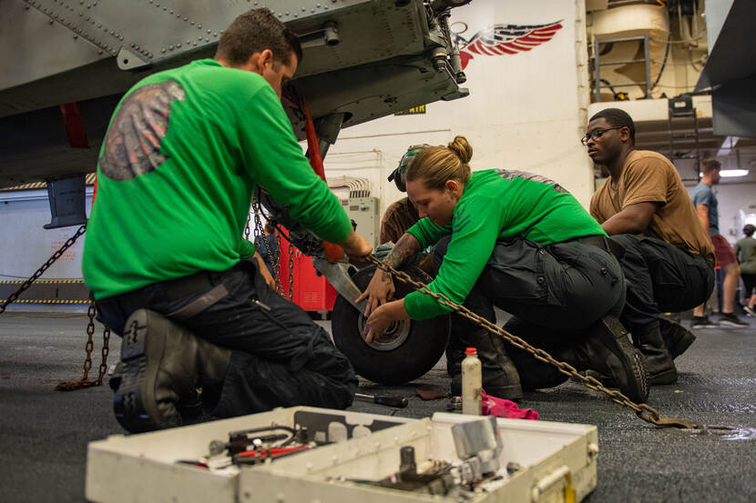 Nog een foto van specialist Berlier aan boord van USS America. Onderhoudspersoneel van Helicopter Sea Combat Squadron 25 is druk bezig met een MH-60S Sea Hawk. De Amerikaanse vloot patrouilleert in de Pacific om de stabiliteit in de regio te bevorderen.
