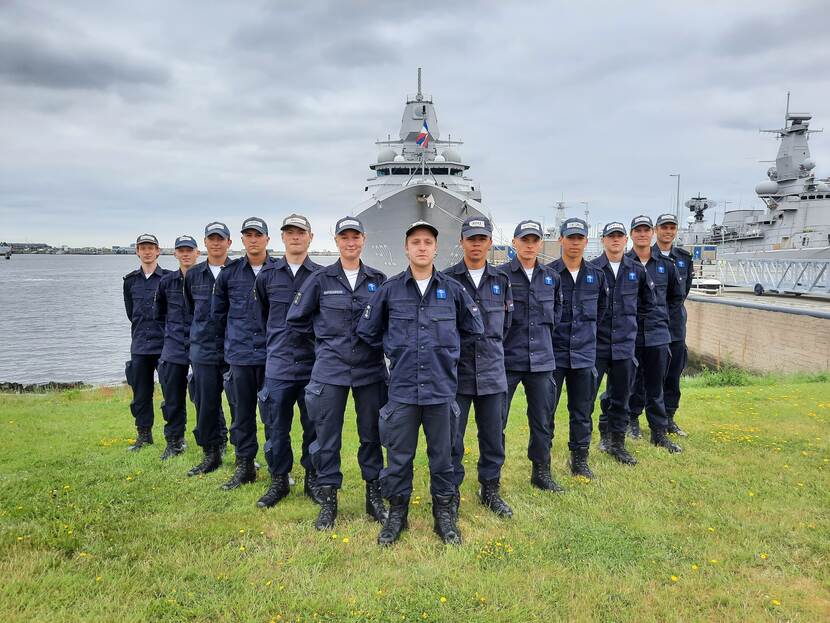 Deelnemers aan de Eerste Maritieme Militaire Vorming maakten tijdens hun bezoek aan de Nieuwe Haven in Den Helder werk van deze foto. De klas bewonderde de vloot en droomde weg bij de gedachte de wereld te bevaren. Korporaal Nautische Dienst Andrew Rep schoot dit bijzonder leuke beeld.