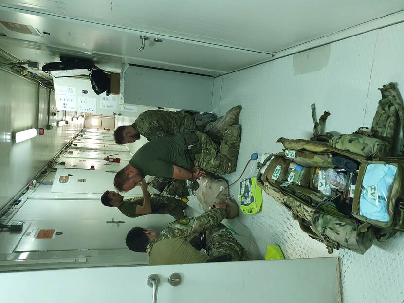 Leden van het National Support Element 1 (NLD) CBMI in het Iraakse Erbil werden gefotografeerd tijdens een oefening ‘hartstilstand bij een collega’. De arts begon met beademen, terwijl een verpleegkundige de medicatie gereedmaakte. Intussen zorgde de ambulancechauffeur voor het infuus. Een passant die toevallig in de Nederlandse kantoorvleugel aanwezig was, assisteerde bij de hartmassage. Bij een buitentemperatuur van rond vijftig graden Celsius is dit een zeer uitputtende bezigheid. De foto is van sergeant-majoor Jacco.