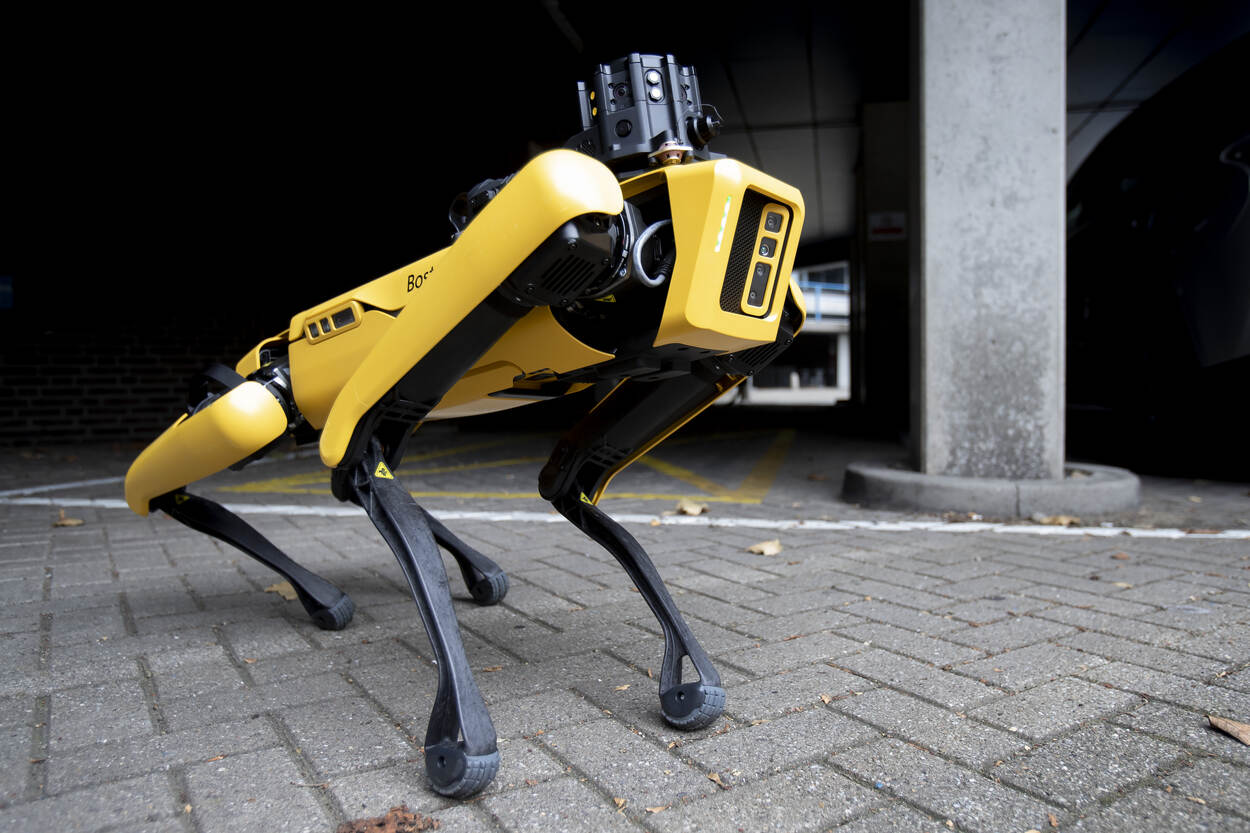 Chi en Van Staveren slaan het geheel tevreden gaande. Met een controller bewegen ze Spot behendig van de vierde verdieping via de lift naar het parkeerterrein. Collega’s die net de auto instappen om naar huis te gaan pakken gehaast hun telefoon om het tafereel vast te leggen. “Logisch hoor”, vindt Chi. “Hoe vaak zie je zoiets in het echt?”