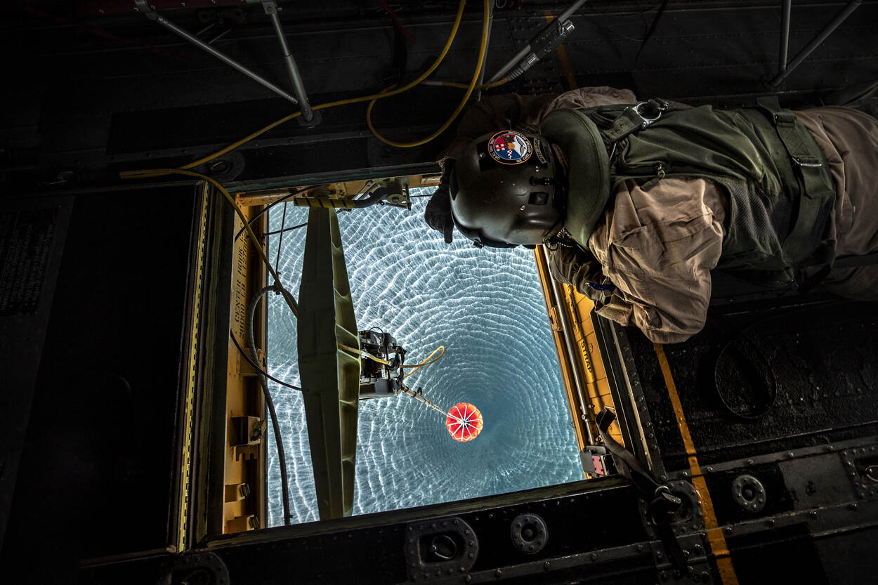 Voor het vullen van de bambi bucket stuurt kapitein-vlieger Irjan de kist naar de Adriatische Zee, bijna letterlijk op een steenworp afstand. De ervaring van de vorige dagen komt goed van pas: “Naast die oude onderzeeër is het meteen gigantisch diep, daar leg ik hem in het water”. Terwijl hij het zegt, ligt sergeant-1 Floris al op zijn buik door het open luik te kijken. Hij geeft een seintje als de zak vol is: “Bucket is full. Pull up gently.