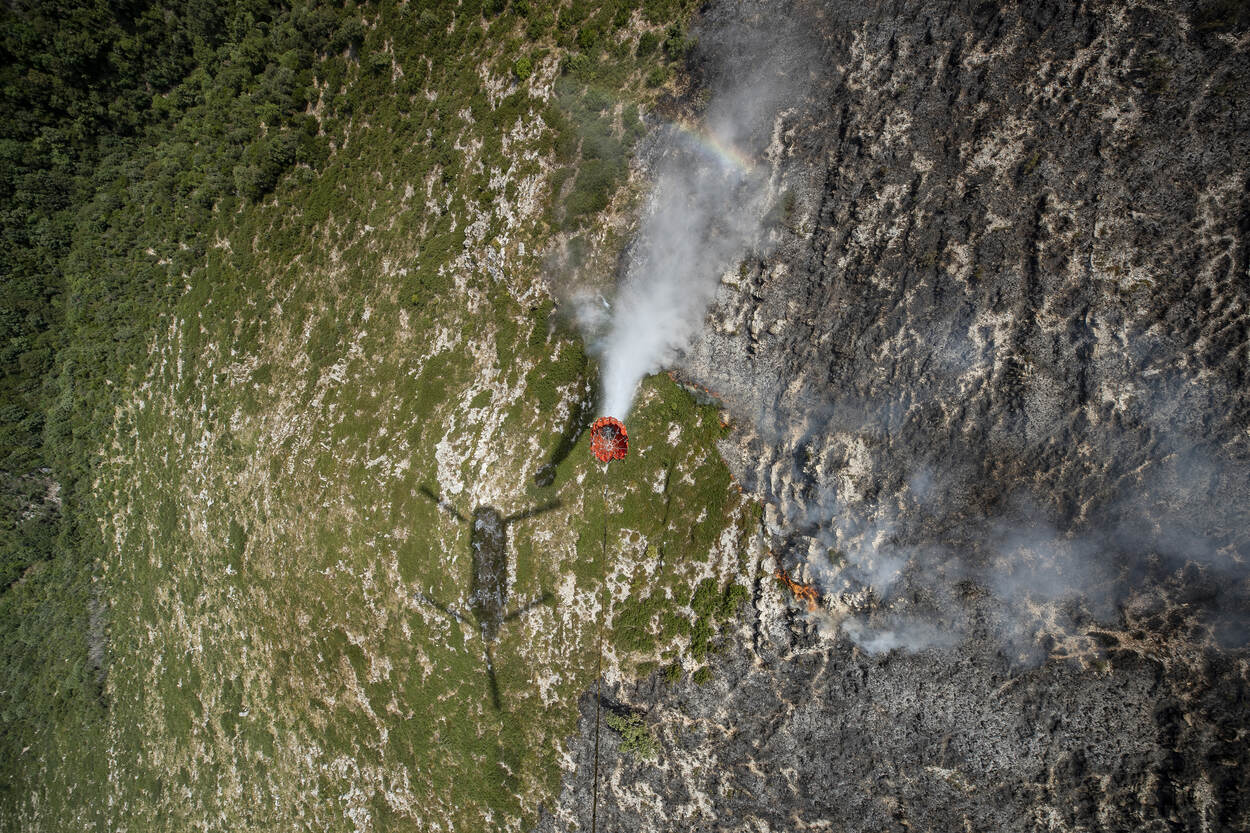 Toch weet hij precies aan te geven waar de bambi bucket opengeklapt moet worden. “Drop, drop, now!!” Duizenden liters water blussen een van de branden op de berg, getuige de enorme stoomwolk die zich achter de Chinook mengt met vieze rook. De neus van de kist draait alweer naar de Adriatische Zee. One down, many to go.