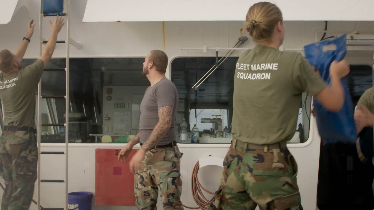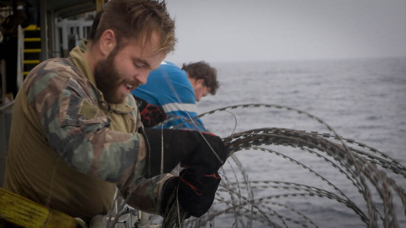 De eerste paar dagen op zee was het detachement vooral druk met het inrichten van de beveiliging, vertelt Merwin. "We moesten de materialen, zoals de wapens, controleren en in orde maken. De tweede dag regelden we de posten voor de MAG, ons middelzware machinegeweer. Er werd een stuk extra op de brugvleugels gelast, zandzakken naar boven gebracht en de affuit op de brug gezet. Diezelfde dag plaatsten we de concertina's, het scheermesjes-prikkeldraad. Meestal een of twee rollen hoog en helemaal rondom het schip."