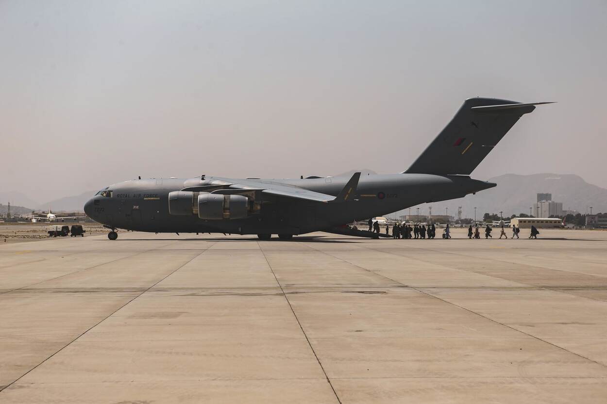 De C-17 is het échte werkpaard van de evacuatie. Dat komt door het grote aantal vliegtuigen uit verschillende landen, de ruimte aan boord en het aantal vluchten dat de toestellen kan maken. Op de foto een Brits exemplaar in Kabul. Foto: Amerikaanse strijdkrachten.