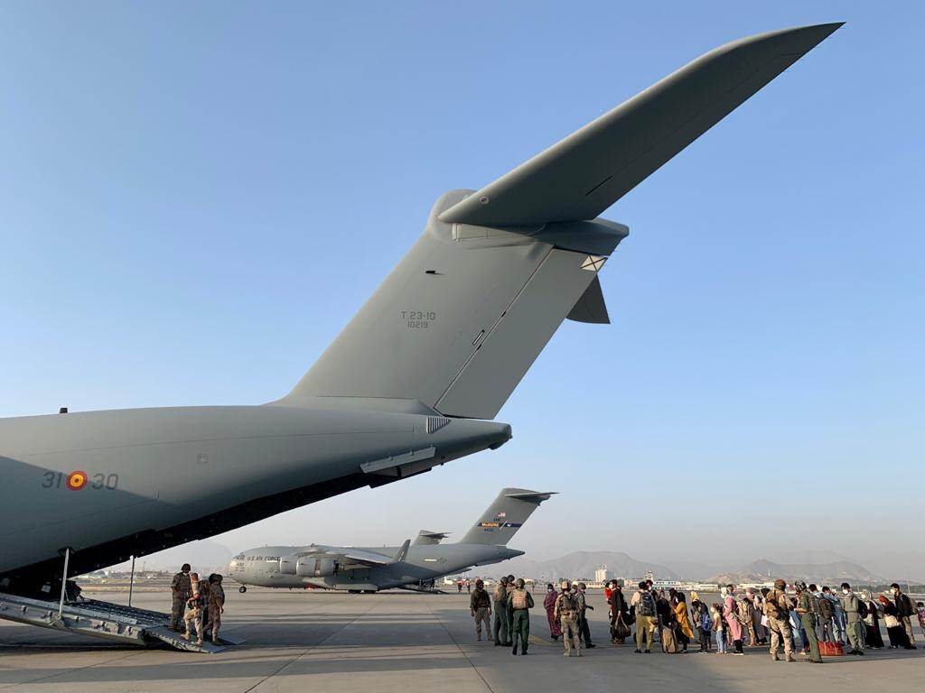 Een Spaanse A400M op de luchthaven van Kabul. Evacués staan klaar om aan boord te gaan. Op de achtergrond een Amerikaanse C-17. Foto: Spaanse luchtmacht.