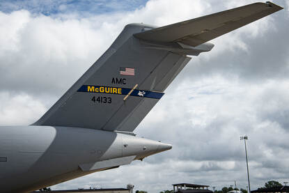 Staart van een Amerikaanse C-17 Globemaster, afkomstig van de 305th Air Mobility Wing op de McGuire Air Force Base in New Jersey. De eenheid heeft als motto 'Can Do'. Foto: U.S. Air Force.