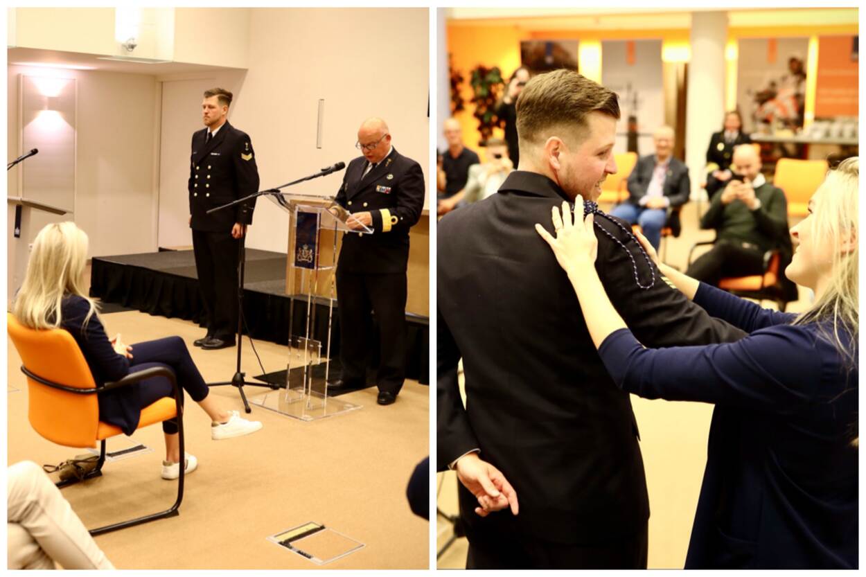 Defensiefotograaf sergeant Jasper Verolme heeft gisteren het blauwe erekoord van de Koninklijke Marine ontvangen, voor zijn levensreddende optreden eerder dit jaar.