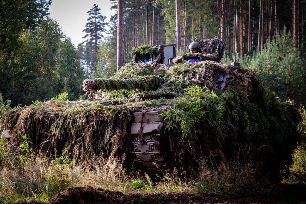 Nederland levert ongeveer 250 militairen aan de NAVO-missie enhanced Force Presence die bedoeld is om de oostflank van het NAVO gebied te helpen beschermen. Op dit moment gaat het bij de Nederlandse eenheid om militairen afkomstig van verschillende eenheden van 43 Gemechaniseerde Brigade uit Havelte. Bij de rotatie die nu in Litouwen is gelegerd hoort ook het Duits-Nederlandse 414 tankbataljon dat normaal in Duitsland is gestationeerd. Het is voor het eerst sinds 20 jaar dat Nederland weer tanks inzet bij een missie. Op de foto een goed gecamoufleerd Nederlandse CV90 pantservoertuig.