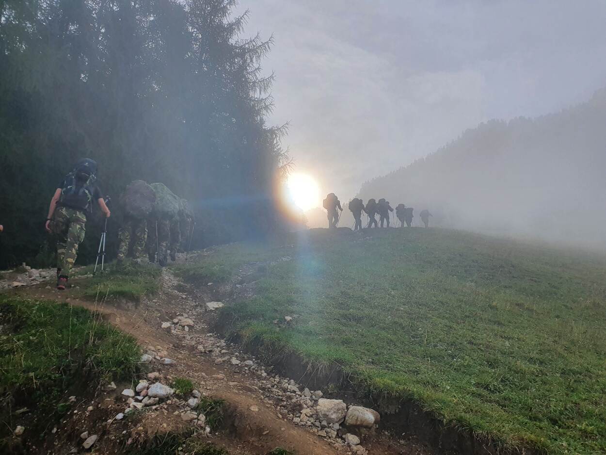 Een tweedaagse bergtocht van militairen van 13 Stafstafcompagnie (13 Lichte Brigade) in de omgeving van het Zuid-Duitse Berchtesgaden inspireerde Davy Heesakkers om deze foto in te sturen. Wat het beeld volgens hem mooi maakt, is dat de silhouetten van de voorste militairen in de mist lijken te verdwijnen, terwijl de uniformen van het personeel op de voorgrond nog mooi 'groen' zijn.