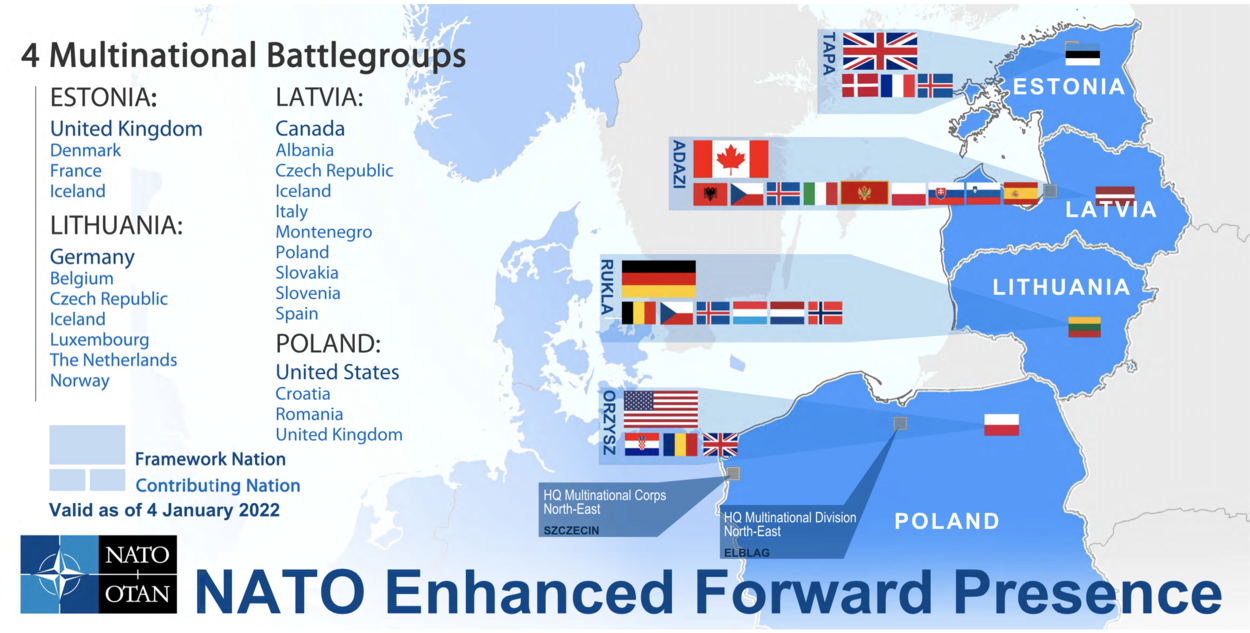 Ook draagt Nederland tot en met eind 2024 met 350 militairen bij aan de enhanced Forward Presence in Litouwen. Ons land maakt daar deel uit van een battle group van landmachteenheden die is gestationeerd in Rukla. Met de eenheden in Polen, Estland, Letland en Litouwen draagt de NAVO bij aan de geruststelling van deze landen. Daarnaast geeft het ook een duidelijk signaal van onderlinge solidariteit af richting Rusland.