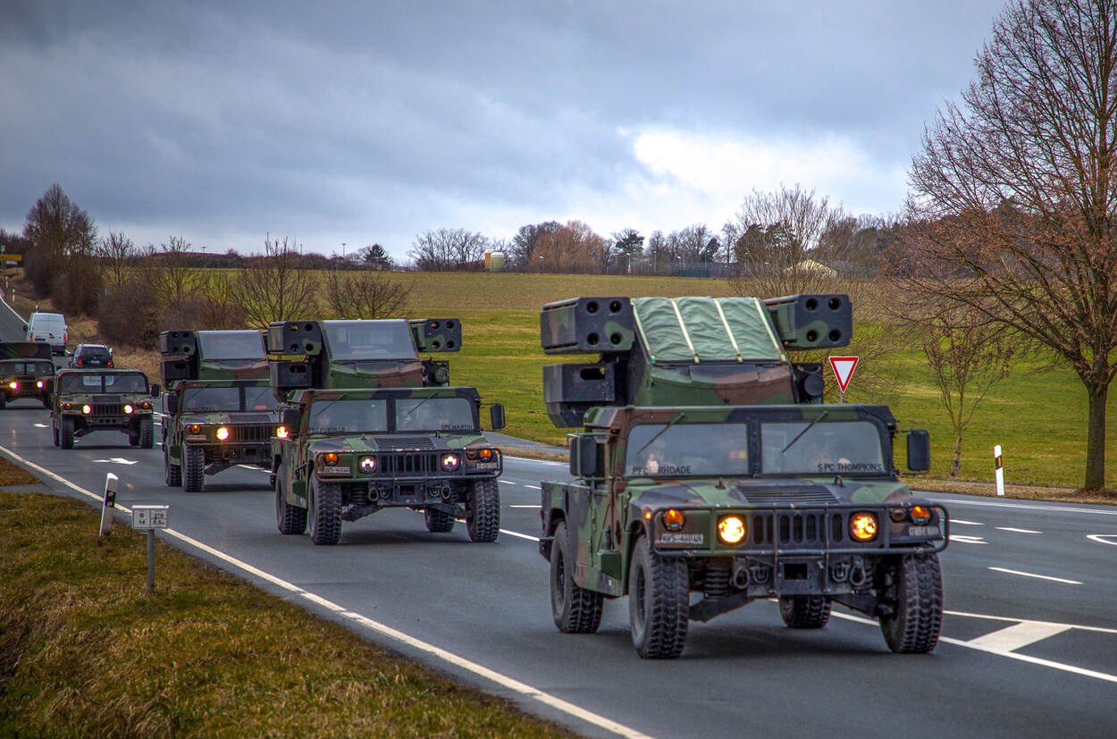 Een kolonne Avenger luchtafweersystemen onderweg van Duitsland naar Roemenië. De systemen van 5th Battalion, 4th Air Defense Artillery Regiment van de Amerikaanse landmacht gaan daar bondgenoot Roemenië helpen verdedigen. Het tafereel werd gefotografeerd door Sergeant 1st Class Terrance D. Rhodes.