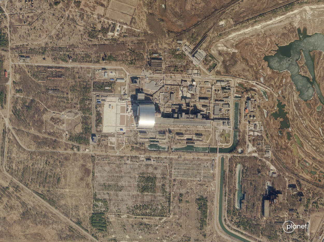 Één ramp met een kerncentrale is meer dan genoeg. In 1986 liepen de zaken in Tsjernobyl extreem uit de hand, de grootste nucleaire ramp tot nu toe. Nu is de voormalige kerncentrale opnieuw in het nieuws. Op deze satellietfoto van Planet LABS PBC ziet het er echter twee dagen na de Russische aanval nog vredig uit.