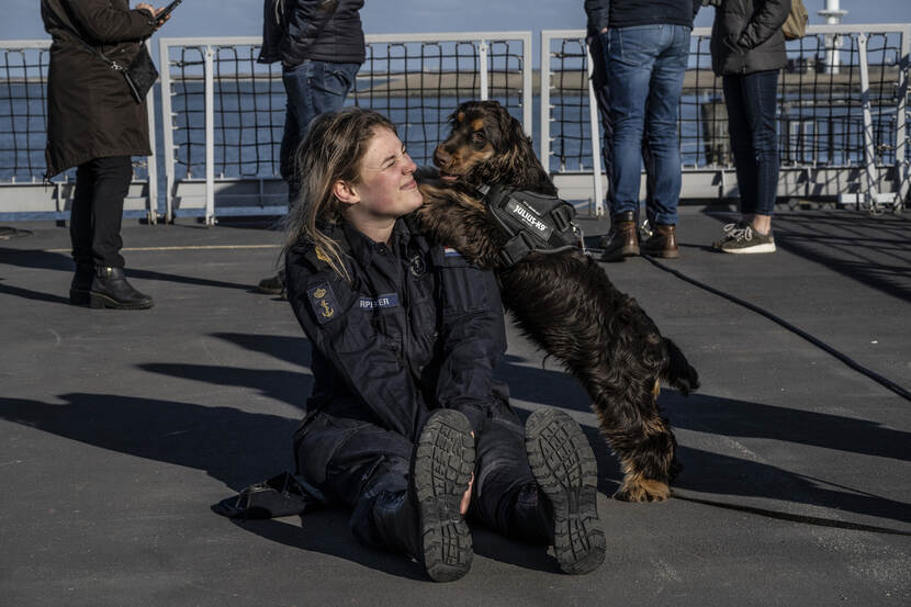 Een vaartocht van enkele maanden betekent ook dat je je favoriete huisdier een tijdje niet meer ziet. Daarvan afscheid nemen is eveneens niet gemakkelijk. En dus nog snel even knuffelen vlak voor je schip uitvaart. Behouden vaart! Foto: John van Helvert.