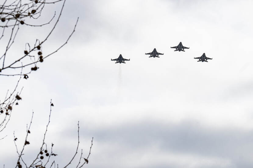 Vier F-16's van de Roemeense en Amerikaanse luchtmacht brengen een eregroet aan acht omgekomen Roemeense bemanningsleden. Dat land verloor onlangs een straaljager. Bij de zoektocht naar de vlieger verongelukte de reddingshelikopter ook, waarbij zeven militairen het leven lieten. Acht doden in totaal dus. Diep triest natuurlijk. Senior Airman Ali Stewart legde de herdenkingsvlucht vast boven de Roemeense hoofdstad Boekarest.