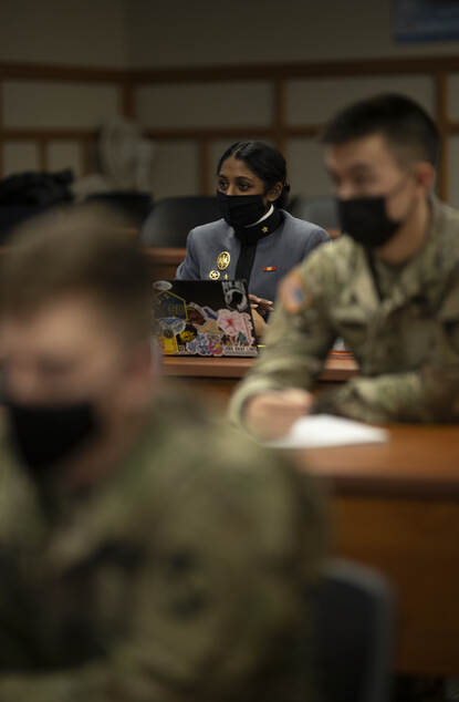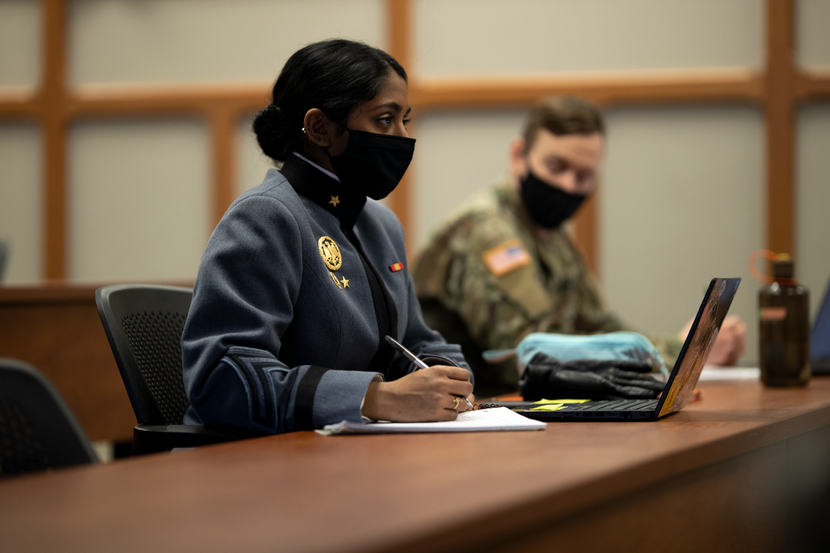“Majoor Coban zijn manier van lesgeven verschilt niet veel van Amerikaanse docenten, máár hij vertelt de lesstof wél vanuit Europees perspectief. Dat is interessant”, aldus cadet Anusha Pakkam.
