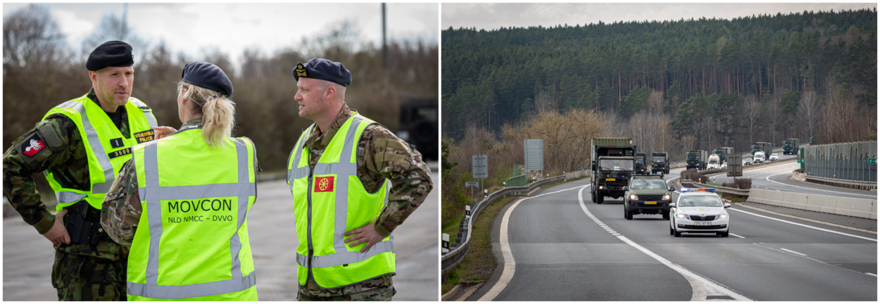 Waar in Nederland en Duitsland nog relatief vrij in pakketten van 9 voertuigen kon worden gereden, staan de Tsjechen en Slowaken erop dat dit in colonnes van 20 voertuigen én onder politiebegeleiding gebeurt. Bij de grensovergang tussen Duitsland en Tsjechië is het daarom alle hens aan dek voor sergeant-majoors Robin en Jeanette van Movement Control (MOVCOM). Razendsnel zetten ze samen met de Tsjechische politie een plek af waar de voertuigen worden opgevangen en samengevoegd. “Het is nogal een stoet waarmee je een land binnenkomt”, legt Robin uit. “Ze willen ons hier graag faciliteren, maar toch ook een beetje controle houden. Dat gaat op deze manier natuurlijk net iets makkelijker.”