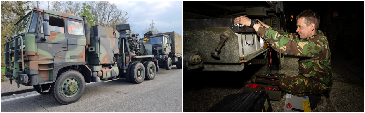 Dat de gloednieuwe Scania’s het redden tot aan Slowakije, daar bestaat weinig twijfel over. Maar de Viertonners uit de jaren tachtig zorgen onderweg, zoals verwacht, al snel voor uitdagingen. Een aantal valt op de eerste dag uit met problemen, andere hebben met enige regelmaat een flinke lik olie of serieuzer onderhoud nodig. Om te zorgen dat pech onderweg niet leidt tot onnodig veel oponthoud rijden er de hele rit twee ‘veegploegen’ mee. Bij mankementen maken zij direct op de vluchtstrook de afweging: is het mogelijk om het voertuig ter plekke te repareren of moet hij worden afgesleept? In het laatste geval wordt een voertuig op de Rest Over Nights (RON) overgedragen aan sergeant-1 Yordie en zijn collega’s van 133 Herstelpeloton. Vanavond is het ‘slachtoffer’ een viertonner met een vermoedelijk accuprobleem. “Het zijn lange dagen”, erkent Yordie. “Maar ach, dat hoort bij het werk. De dankbaarheid van de chauffeurs de volgende dag maakt een hoop goed.”